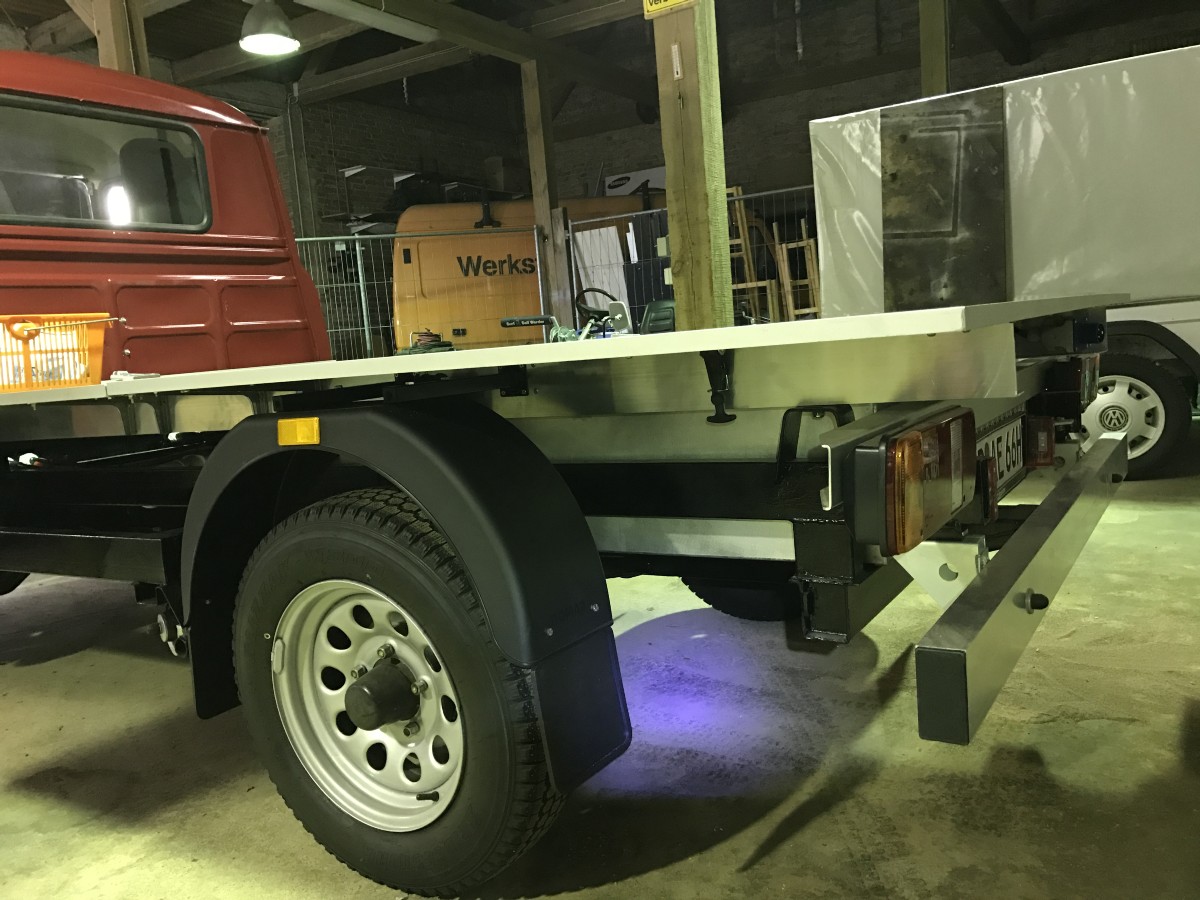 In diesem Zuge wird auch ein neuer Lampenträger mit modernen Rückleuchten angefertigt und der Unterfahrschutz als Aluminium-Profil ausgeführt. Hier soll später auch noch ein Rückfahrsystem verbaut werden. Das mühsam erworbene H-Kennzeichen wird irgendwann einem modernen E-Kennzeichen weichen, aber bis dahin ist es noch etwas hin.... | |
