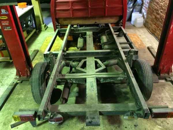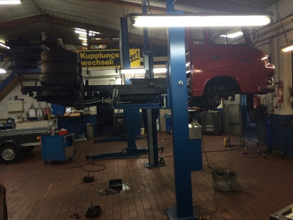 Mit dem Kofferaufbau ist der Barkas natürlich für einen Elektroumbau nicht optimal. Der Koffer muß erstmal weichen. Also die sechs Schrauben ab und hoch damit. | |