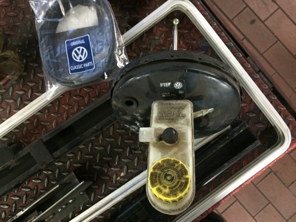 Leider zeigt sich beim Bauen, daß der Abstand zum Rahmen beim Zweitakter partout nicht ausreichen wird, um den BKV einzubauen. Offensichtlich hatte man beim Viertakter genau aus diesem Grunde die Pedalwelle geändert. Wir haben das bis heute nicht bereut. Das Auto bremst auch jetzt im fertigen Zustand phantastisch wie jeder andere moderne PKW oder Transporter auch - dies bei mäßiger Pedalkraft. | |