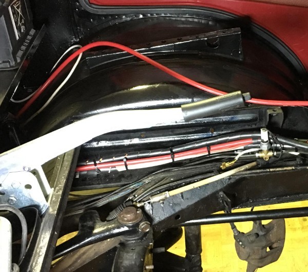 Der Kühlwasserbehälter ist aus dem Beifahrer-Fußraum bereits verschwunden. Der wegfallende Wasserkühler gibt viel Platz frei , so daß die Scheibenwaschanlage hinter den Grill wandern kann. Damit haben wir keine Wartungsarbeiten mit Flüssigkeiten mehr im Innenraum. Es ist noch geplant, die Schraubbefestigung des Grills zur besseren Zugänglichkeit beim Nachfüllen durch einen Klappmechanismus mit Innenraum-Entriegelung zu ersetzen. | |
